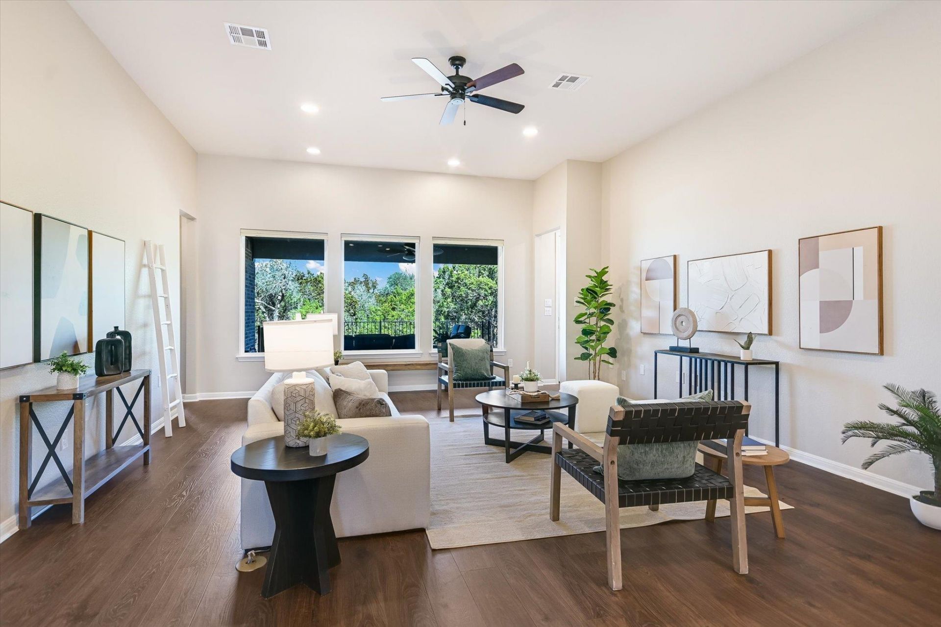 Open this weekend! RARE one-story home with VIEWS of the protected greenbelt! Built in 2024 by Taylor Morrison, this beautiful 4-bedroom, 3.5-bathroom home is move-in-ready and PACKED WITH UPGRADES. This single-story gem offers a PROTECTED GREENBELT VIEW, making every morning feel like a retreat. The heart of the home features a gourmet kitchen, with top-of-the-line stainless steel MONOGRAM GOURMET SERIES APPLIANCES and an impressive 6-burner PROFESSIONAL GAS COOKTOP that will delight any cooking enthusiast. (We particularly love the Smart French Door and the Advantium Speedcook ovens.) The custom granite countertops are simply gorgeous, and the farmhouse sink is a timeless feature. Buyers will love the thoughtful floor plan, including a dedicated office with French doors, and a versatile flex space that can be used as a media room, exercise area or playroom. For those with an active lifestyle, you'll appreciate the seamless flow of durable Revwood flooring through the entry, dining, kitchen, flex room, and family rooms, complemented by upgraded carpet in all bedrooms. For those who love to organize, the home is equipped with ELFA closet organizer systems in the primary closets, guest bedroom closet, pantry, laundry room, hall closets, and even the garage, ensuring that every item has its place. Step outside to a covered patio and extended outdoor deck where you can enjoy your morning coffee or evening wine. This area is perfect for entertaining or simply relaxing in the tranquility of nature. Located in the 60s section of Parkside on the River, this cul-de-sac location is quiet (not near the main thoroughfare) and offers a vibrant community lifestyle with amenities such as a community pool, playground, hiking trails, pickleball courts, and more. Plus, you're just a short drive from all the charm and activities that historic Georgetown has to offer, and popular Garey Park is located just down the street.