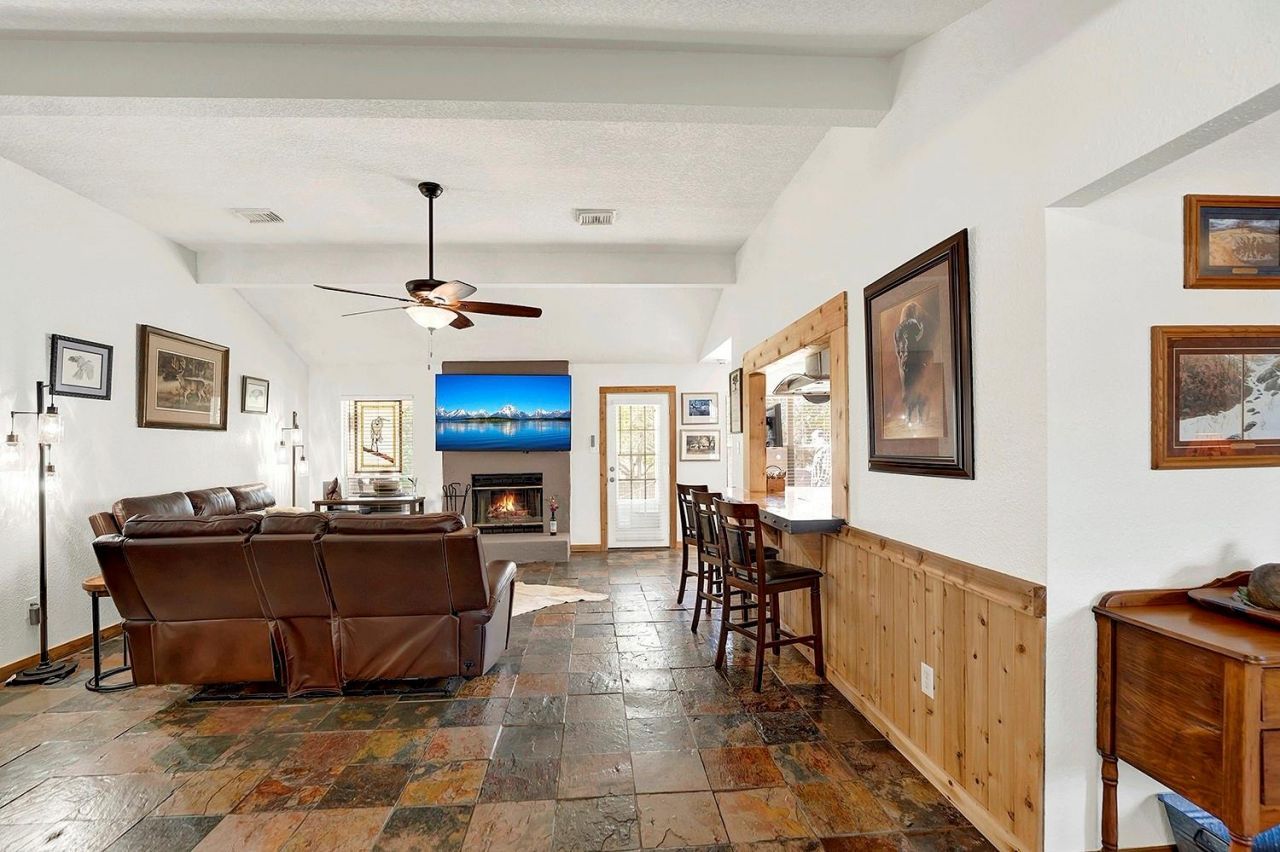 This beautiful property is situated on a heavily-treed, oversized lot located near the lake and features abundant workshop & storage space. Home has gorgeous slate floors throughout, a wood burning fireplace, and one-of-a-kind kitchen countertops made of travertine tile sealed in epoxy. Primary bath features dual vanities, dual closets, soaking tub, and separate shower. Oversized garage includes plenty of workshop and sitting space, a long wet bar for anyone's man cave or party aspirations, as well as a half bath that could be upgraded with a shower. There's also decked storage space in the garage attic that represents 60%(!) of the floor space. This garage space is fully insulated, including the garage door. Additional garage/workshop space can be found on the other side of the home with a 20x20 metal building that has a 10x10 garage door and a 220 outlet. A double gate, 16 ft wide and separate from the main driveway gate, opens at the street and leads to this metal building. There is also a 10x12 storage shed. Featured updates include AC in 2021, roof in 2014, sewer line for septic in 2020. Minimal neighborhood restrictions. Access to community clubhouse/swimming pool/tennis & basketball courts with a minimal fee. Buyer to confirm taxes, schools, proximities, sq ft & lot size. See it soon--at this price, with all that this property has to offer, this one will not last!