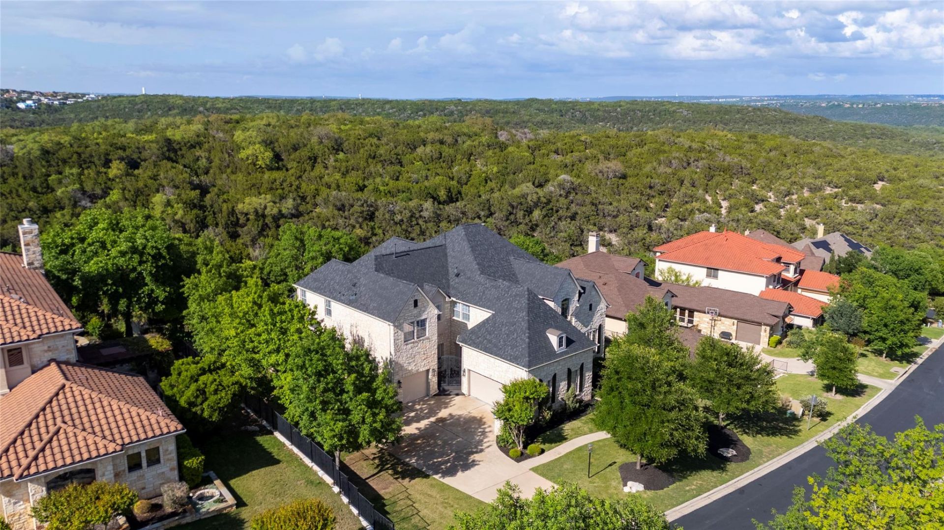 Soaring ceilings and a curved staircase create a grand first impression, inviting you to a beautifully remodeled great room with custom lighted built-ins, chevron-pattern mantle and statement chandelier. The expansive study and dining room both open to a private courtyard, creating a daytime getaway for the work-from-home professional. The lavishly-equipped gourmet kitchen is not only designed for everyday living but also entertaining, with separate built-in Dacor refrigerator and freezer, two apron sinks, and a luxurious Dacor dual oven/six-burner gas cooktop, underneath a custom range hood with pot filler. The well-appointed auxiliary kitchen includes stowed appliance cabinets, dry bar, wine fridge, and walk-in pantry. Breathtaking hill country views await from the main floor balcony and custom spiral staircase. The expansive primary en suite features split dual vanities, jetted soaking tub, walk-in shower with dual showerheads and two large custom closets. Take either the front or back staircase up to reveal family living at its finest, featuring three bedrooms, wonderfully remodeled bathrooms, a game room and media room. A picturesque floor-to-ceiling Cantera slider and French door lead to an outdoor private oasis, with covered flagstone patio and soothing waterfall and koi pond, all enclosed by the greenbelt and mature trees. Finally, a sprawling unfinished basement provides an inspiring opportunity for the next owner to shape the space to reflect their unique vision and lifestyle. Located in the gated Ridge at Alta Vista, residents enjoy a community pool, fitness center, sport courts and playscape just minutes from the Hill Country Galleria, Bee Cave, Lakeway and Lake Travis with access to Lake Travis ISD and nearby shopping, dining and recreation.
