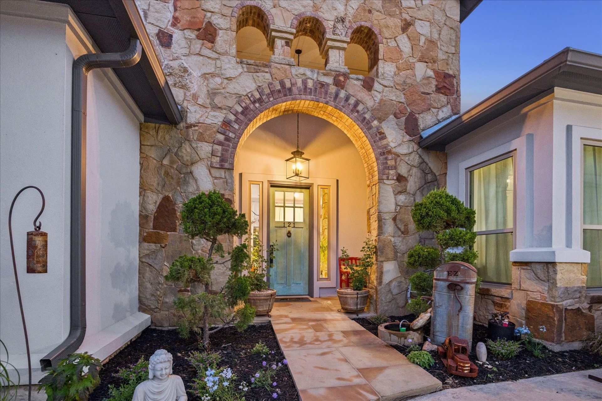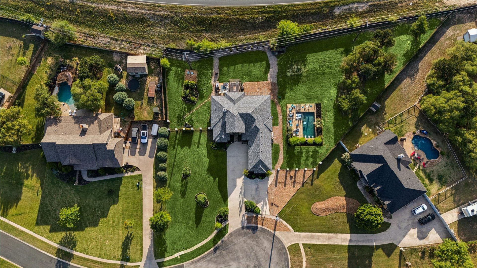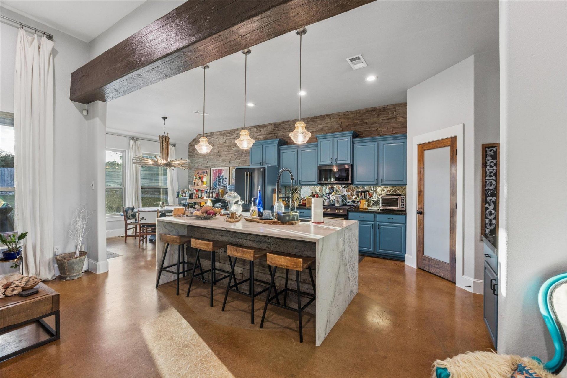 Generously set on one acre +/- lot, custom designed upgrades complement thoughtfully designed four-bedroom layout with dedicated French-door framed office and open concept living complemented by multiple outdoor areas.Statement turquoise front door opens to beamed entry highlighted by a Restoration Hardware chandelier, setting the tone for eclectic designer fixtures that convey throughout. West-facing windows offer Hill Country tree-lined views that reinforce the natural surroundings. Anchored by a striking floor-to-ceiling sandstone fireplace, the living room flows seamlessly into the freshly updated kitchen and dining space, showcasing rustic stained concrete flooring throughout.The kitchen serves as the centerpiece of the home with custom Venetian glass backsplash and pendant lighting framing brand-new Forno appliances, including range and dishwasher. Dramatic marble waterfall island extends into the dining space beneath eye-catching driftwood chandelier.The primary suite offers a spacious retreat with vaulted tray ceiling and sheer bamboo window coverings accenting outdoors. Remodeled primary bathroom features floor-to-ceiling ceramic tile in walk-in shower, moonstone countertops, wood vanities with copper hardware, leathered granite shelving nooks, and his-and-her closets.Outdoor living begins with covered sandstone patio with dual fans, outdoor BBQ kitchen with Green Egg, KitchenAid gas grill, cedar pergola with exterior lighting, and second fireplace near the patio, with an additional firepit out back. Custom GK Pool installed in 2020 includes a beach landing with waterfall feature and umbrella set for resort-style experience.See MLS docs for full upgrades list including 2021 Ringer windows, 2018 roof replacement with 150-mph shingles, HVAC service, and fresh interior paint.Oversized 3-car garage with extended driveway and sport court provides ample parking, with convenient access to Hwy 29 and Hwy 183 and close proximity to Austin.