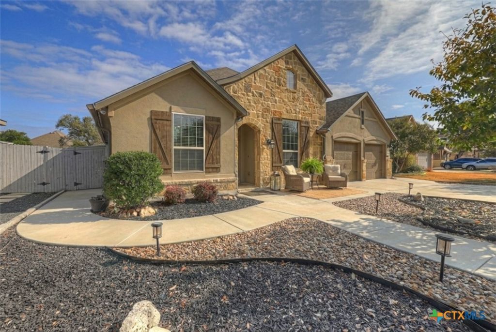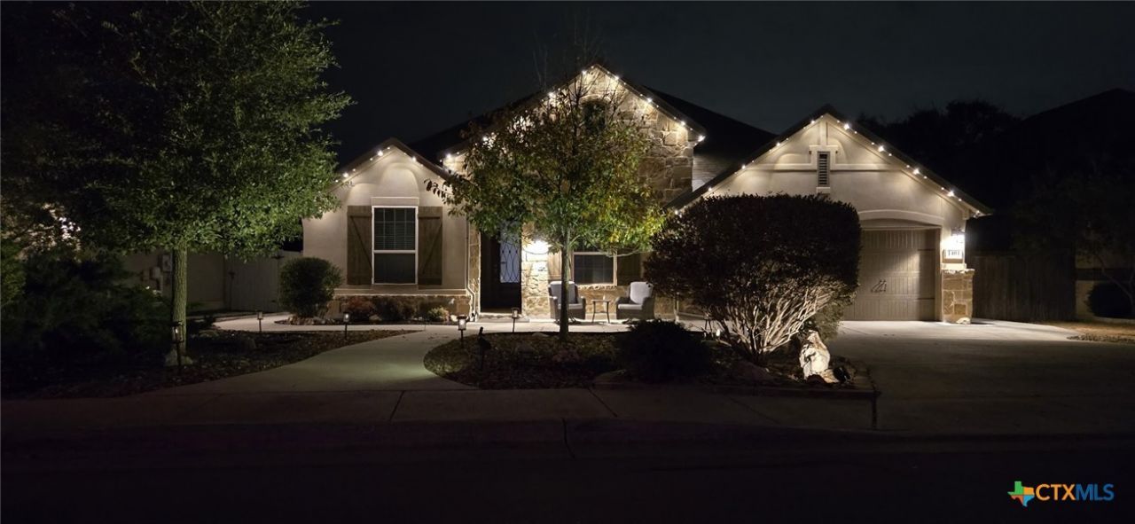Welcome to this beautifully designed single-story home in the highly desirable Settlement at Gruene, just a quick golf-car ride away from the Historic Gruene District and the Landa Golf Course. Seller is conveying a 4-person 2021 E-Z-GO Express Elite golf-car with a lithium battery with this home! This home is thoughtfully crafted with inside and outside entertaining in mind. The popular floor plan offers an open layout that seamlessly blends everyday comfort with upscale style. The heart of the home is the island kitchen featuring quartz counter tops, gas cooking, a water filtration system, abundant workspace, and an easy flow into the main living and dining areas. With two dining spaces, a dedicated office, media/flex room, and four spacious bedrooms arranged in a split floor plan, there's room for everyone to live, work, and relax in comfort. Step outside to your private backyard that backs to a greenspace, and you'll discover an extensive outdoor patio designed for gathering and conversation. Multiple entertaining areas, paved walkways around the perimeter of the home, and a gas connection on the back porch for a future grill make outdoor living effortless. Xeriscaped front and back yards provide beauty with easy maintenance and water conservation in mind. Permanent soffit lighting adds both charm and convenience year-round and is easily adjustable by smart phone. The three-car tandem garage is treated with a professionally installed epoxy coating and offers ample space for vehicles, storage, or hobbies. Located within New Braunfels Independent School District and just minutes from New Braunfels attractions such as Schlitterbahn, river activities, shopping, dining, and major thoroughfares, this home delivers the perfect balance of charm, convenience, and modern living in one of the area's most sought-after neighborhoods. Schedule your private showing today!