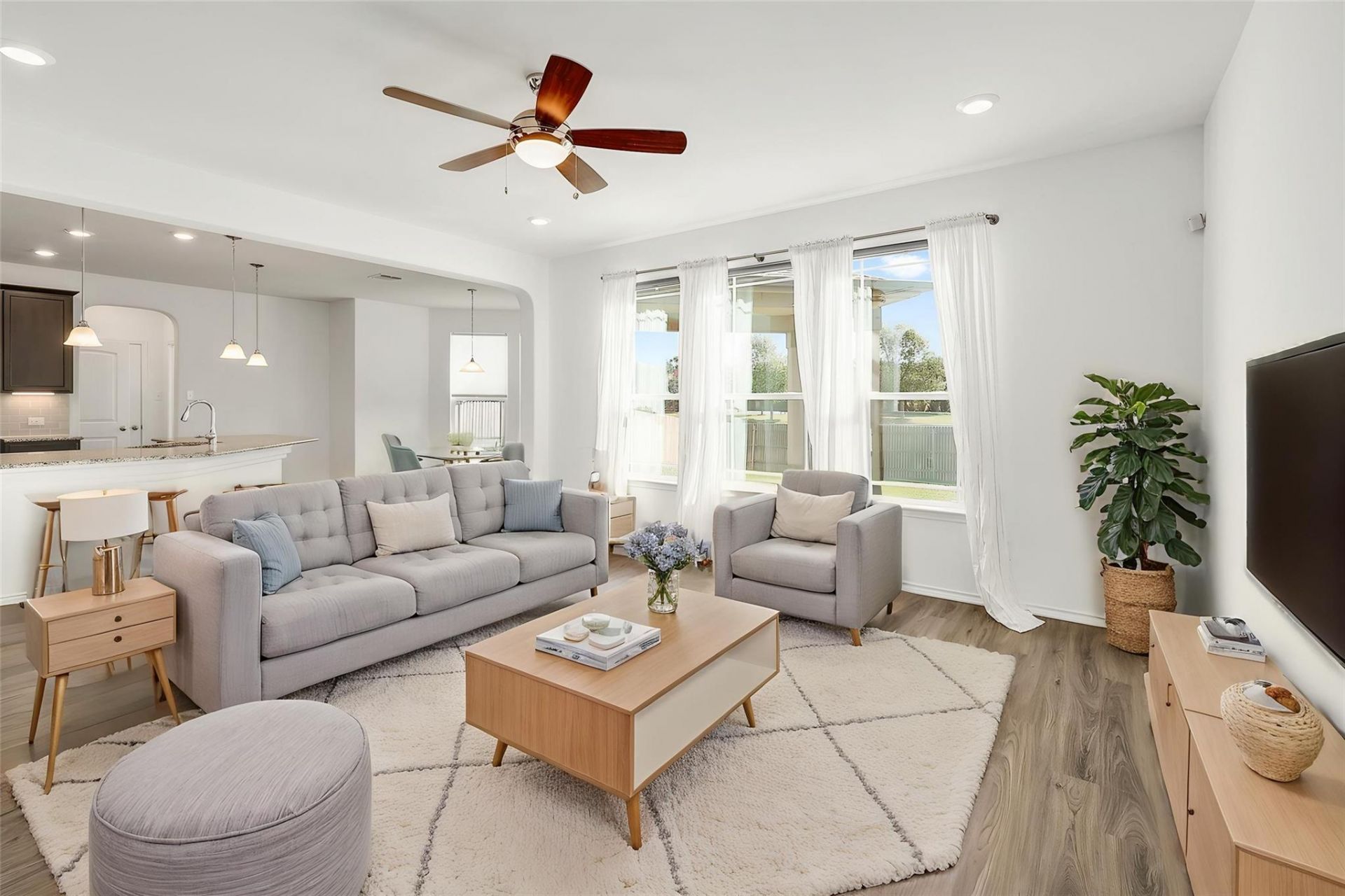 You're going to love this home in Georgetown. This beautiful brick home is situated on a large lot with no neighbors directly behind. Featuring brand new paint throughout, recessed lighting, s/s appliances, rich cabinets, granite counters, under cabinet kitchen lighting, luxury vinyl flooring and window coverings. The spacious floor plan features a home office, formal dining room, large living room that opens to the oversized kitchen that features a second dining area. Upstairs you'll enjoy a large loft/game room, and 3 bedrooms. The bedrooms are all roomy and have walk-in closets. The owner's suite features a retreat for privacy. Sit on your private covered back porch and enjoy the backyard, which is perfect for entertaining. This home is located on a greenbelt, close to the community center, which features a sparkling pool. The community common areas provide a playground, 2 basketball courts, along with a picnic area. Don't miss out on this well maintained and well-priced home!