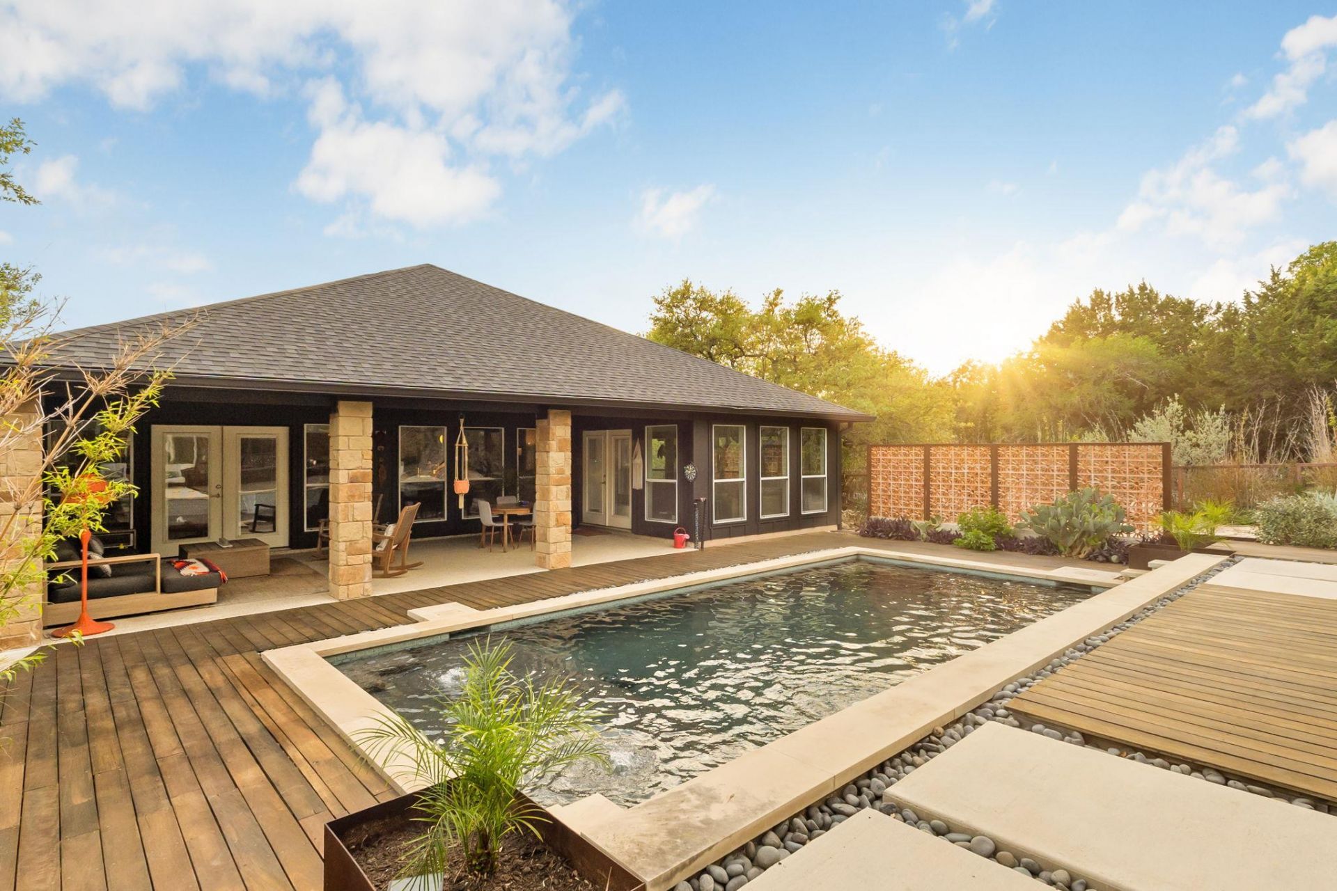 Open House Sunday 2-4! Main house 3/2 + guest casita with full bathroom. Set on a quiet cul-de-sac in Wimberley, this thoughtfully updated home offers a rare balance of stylish interior finishes and a retreat-level outdoor living environment.The 3 bedroom, 2 bathroom main house features an open layout with high ceilings, beautiful natural light, and a spacious kitchen designed for both everyday use and entertaining. The floor plan offers the perfect balance of seamless connection and separation between private and shared spaces. The tucked-away primary suite offers a sense of privacy and opens directly to the covered patio for easy indoor-outdoor flow.Outside, the artfully landscaped backyard has been designed as an extension of the home. A pool with waterfall, therapeutic hot tub, and outdoor shower are integrated into the setting, with multiple seating areas and a fire pit that support both gathering and quieter moments throughout the day.The detached casita with front porch overlooks the pool and offers an inviting separation from the main home. With a spacious bedroom, office nook and a full bath, it provides flexibility for guests, a private office, or additional living space.Updates to the home include interior and exterior paint, all new light fixtures, primary bath steam shower, kitchen tile and appliances, newer roof (2024), newer water heaters (2022), and a whole-home generator, resulting in a home that is as functional as it is beautiful.
