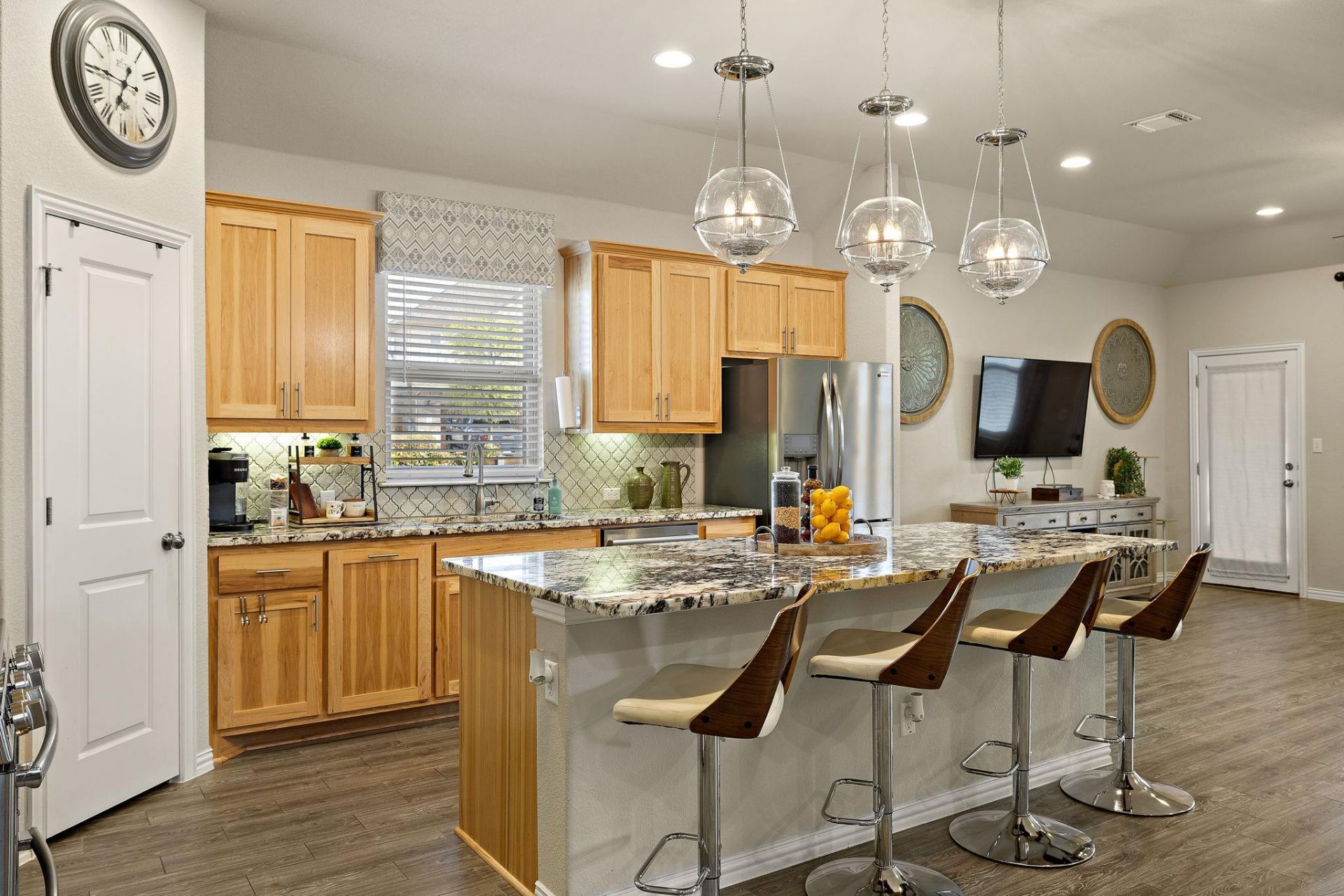 Gorgeous former M/I Homes model in the highly sought-after Carmel Creek community in Hutto, loaded with upgrades and ready for its next owner! This beautifully designed home features 3 bedrooms, 2.5 bathrooms, and a dedicated office/flex space downstairs, offering both functionality and style.Upstairs, youll find a spacious game room with a built-in office nook and half bathroom, along with a secondary bedroom featuring its own en-suite bath?perfect for guests or added privacy.This home is truly upgraded throughout, showcasing beautiful flooring, designer tile, high-end cabinetry, upgraded countertops, and a stylish backsplash. The gourmet kitchen is a standout, complete with a gas double oven, pendant lighting, and ample counter space for cooking and entertaining. Custom woodwork details add character and charm throughout the home.The primary suite is a true retreat, featuring a large bay window and a custom sliding door leading into the spa-like bathroom, which includes an oversized walk-in shower, dual vanities, and floor-to-ceiling tile?a feature carried throughout all bathrooms in the home.Step outside to a private, charming backyard with a covered patio, perfect for relaxing or entertaining. Situated on a corner lot with upgraded landscaping, this home offers both curb appeal and convenience.Ideally located directly across from a park and picnic area and within walking distance to the neighborhood pool and amenities. With quick access to Hwy 79 and Hwy 130, commuting to Tesla, Samsung in Taylor, Austin-Bergstrom Airport, and Downtown Austin is a breeze.Welcome home!