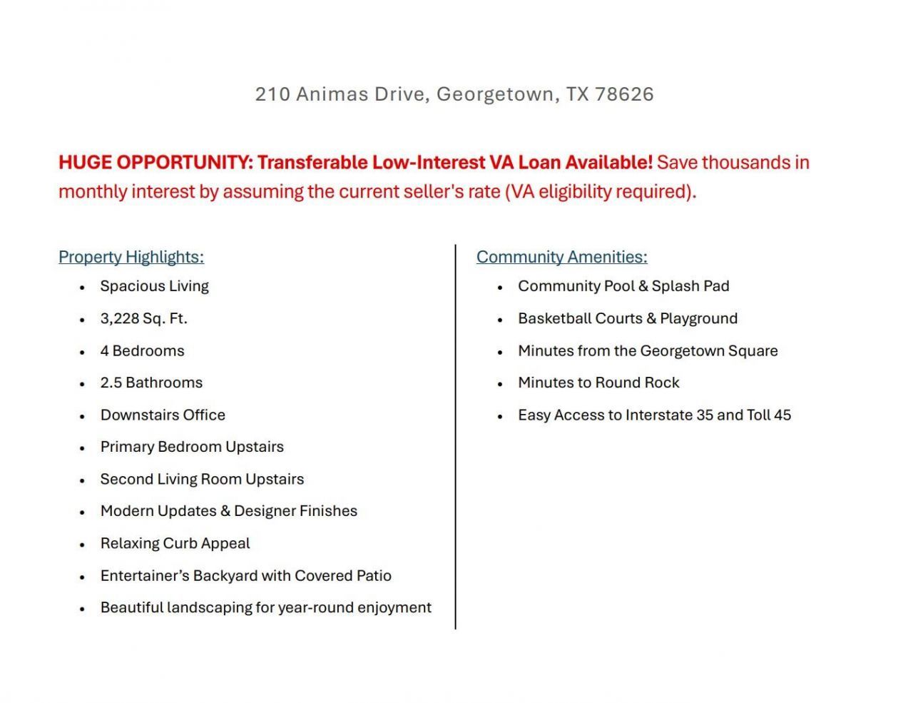 Motivated Sellers have a LOW INTREST RATE VA LOAN that can be TRANSFERRABLE to another VA eligible buyer! Buyer Concessions Available! Welcome to this spacious two-story home, nestled on an amazing cul-de-sac with VERY FRIENDLY NEIGHBORS in the highly sought-after LaConterra neighborhood of Georgetown, Texas. This home offers a fantastic blend of modern updates and classic charm, providing the perfect backdrop for your next chapter! With four bedrooms and two and a half bathrooms, there's plenty of space for everyone. The interior has been thoughtfully updated, featuring fresh paint and new flooring throughout. The downstairs living room is a true showstopper, with custom built-in media and cabinets that add both style and function. The kitchen is complete with beautiful granite countertops, a generous island, and a separate space for a breakfast table. Adjacent to the kitchen is an elegant, separate dining room, perfect for hosting dinner parties and holiday gatherings. Upstairs, a second living room provides a versatile bonus space that can be easily transformed into a media room, game room, or even a quiet retreat. The large, rear-facing primary bedroom is a peaceful sanctuary, complete with a generously sized walk-in closet. A private office on the first floor offers a dedicated space for work or study. Outside, the front porch invites you to relax with a cup of coffee in your rocking chair. The backyard is a wonderful area for entertaining, featuring a large covered patio and a newly stained privacy fence. The two-car garage provides ample storage and parking. This home is ready for you to move in and start making memories. Don't miss your chance to own a piece of this wonderful community!