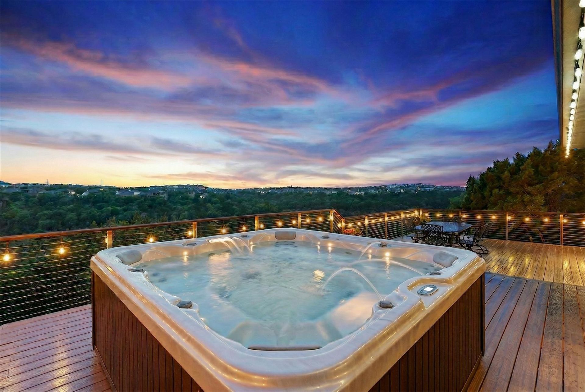 As golden hour lingers over rolling green hills, you arrive through a secluded courtyard where the soft murmur of a fountain and the glow of a firepit signal a home designed for both retreat and connection. Beyond this intimate entry, 215 Rocky Coast Drive unfolds into a thoughtfully elevated residence where panoramic, protected greenery views stretch beyond an expansive Trex deck, enhanced by custom lighting that creates a warm backdrop for evenings spent entertaining or unwinding in the private hot tub. Inside, the home blends refined design with everyday functionality, anchored by a fully renovated chefs kitchen featuring custom Thomasville cabinetry, striking quartzite countertops, and upgraded appliances including a wine refrigerator. Natural light pours through newly installed Andersen and Marvin doors and windows, enhancing indoor-outdoor flow and framing tranquil views throughout. The main level offers a versatile guest suite with a built-in Murphy bed, while a detached casita with a full bath provides a private retreat for guests or multigenerational living. The primary suite serves as a serene escape with a spa-inspired bath, complemented by additional renovated bathrooms that reflect a cohesive aesthetic. Enhancements such as Elfa custom closets, an expanded laundry room, and updated systems?including HVAC and water heater?deliver comfort and peace of mind. The lower level extends outdoors with a private pool, multiple lounge areas, and layered entertaining spaces designed for both day and evening enjoyment. Located in the resort-style community of Rough Hollow in Lakeway, residents enjoy lakefront amenities, a marina and yacht club, fitness center, scenic trails, and a vibrant social lifestyle near Lake Travis. With a car charger, upgraded garage systems, and extensive improvements, this home offers a refined, design-forward Hill Country lifestyle.