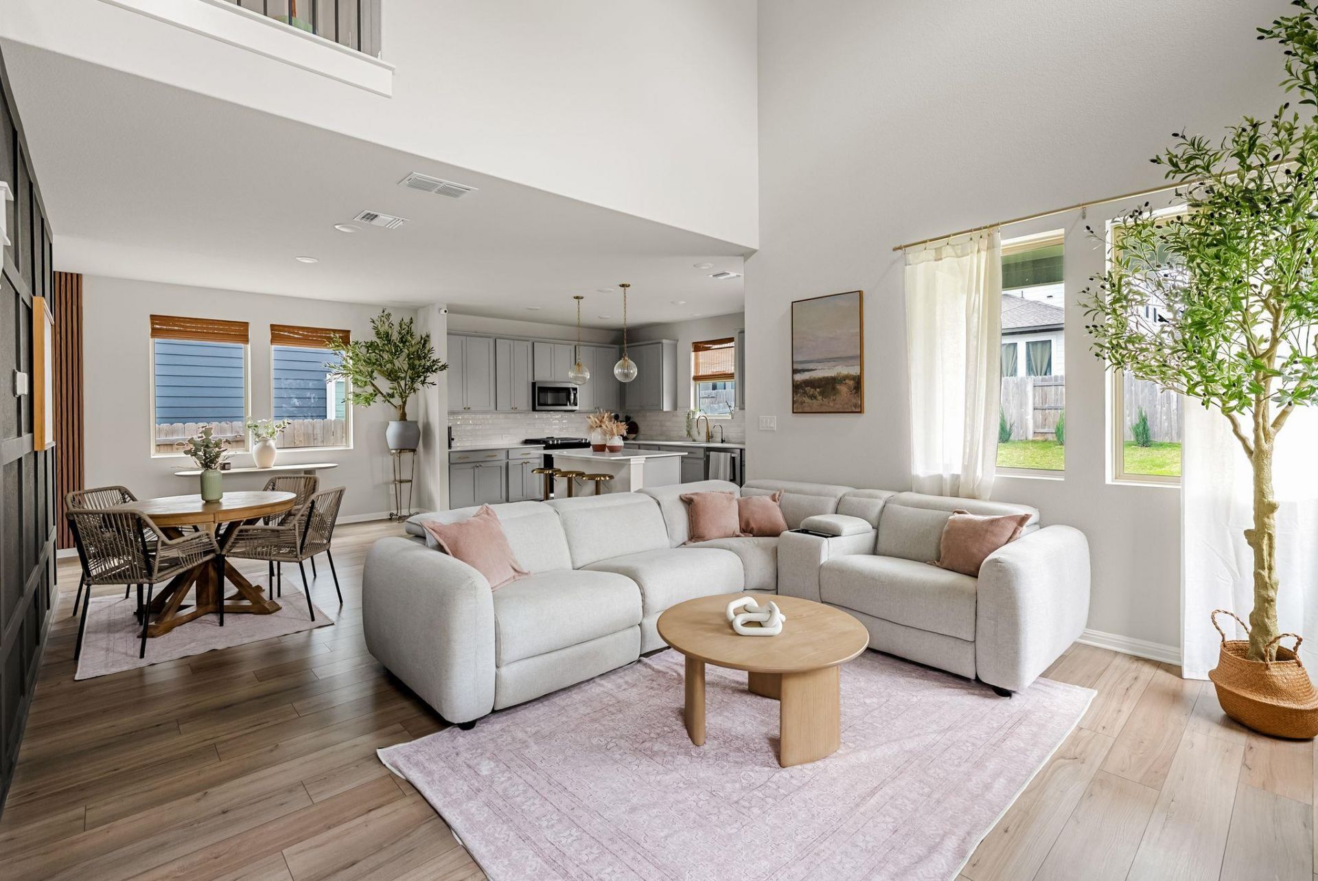 Modern energy efficient home in highly sought after Lariat with solar panels, whole home water filtration, and extensive upgrades. Downstairs features an open concept living, dining, and kitchen plus a custom reading room and office flex space that is perfect for work from home, homework, or a cozy book nook. The kitchen offers quartz counters, stainless steel appliances, gas range, large island, and great storage. Upstairs you will find a spacious owners suite with walk in closet and well appointed bath, plus secondary bedrooms sized for family, guests, or an additional office. Solar panels help offset monthly electric costs and the whole home filtration system provides cleaner water for drinking, cooking, and bathing. Lariat is a master planned Liberty Hill community designed for families, with resort style amenity center, pool, splash pad, parks, trails, and planned onsite schools in Liberty Hill ISD. This home is walking distance to the amenity center and pool as well as the brand new on site Lariat Trails Elementary, just a couple of blocks away and scheduled to open this fall, with easy access to Highway 29 and the greater Austin area.