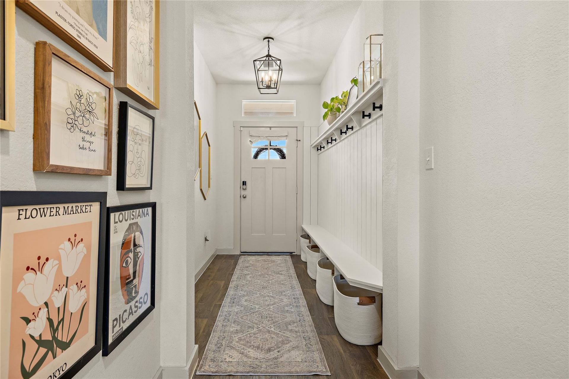 Nestled on a quiet and friendly street in the heart of Hutto, this stunning 4-bedroom, 2-bathroom home offers the perfect blend of modern sophistication and small-town charm. The residence features a bright and airy open-concept layout that seamlessly connects the main living areas. The chef-inspired kitchen serves as the home's centerpiece, boasting a bold navy-blue island with breakfast bar seating, crisp white cabinetry accented by elegant gold hardware, and a classic subway tile backsplash. Just off the kitchen, the spacious living area is anchored by a sleek electric fireplace with a custom wood mantle and vertical accent wall?a high-end upgrade completed in 2025. The thoughtful interior enhancements continue with a newly designed front entry mudroom space, providing both style and organization as you enter the home. Practicality meets comfort with a split-bedroom floor plan that ensures privacy for the primary suite. The backyard was transformed in 2023 into a low-maintenance oasis featuring professional zero-scaping, an extended patio, and a trendy cowboy pool that stays with the home for the new owners to enjoy. Positioned within the Mustang Creek community, this property includes a 2-car garage and a full in-ground automatic sprinkler system. Enjoy being just a short walk from the community playground, 0.2 miles from Mustang Creek Park, and just 2.5 miles away from the historic downtown district, providing easy access to local dining and the growing Co-Op District.