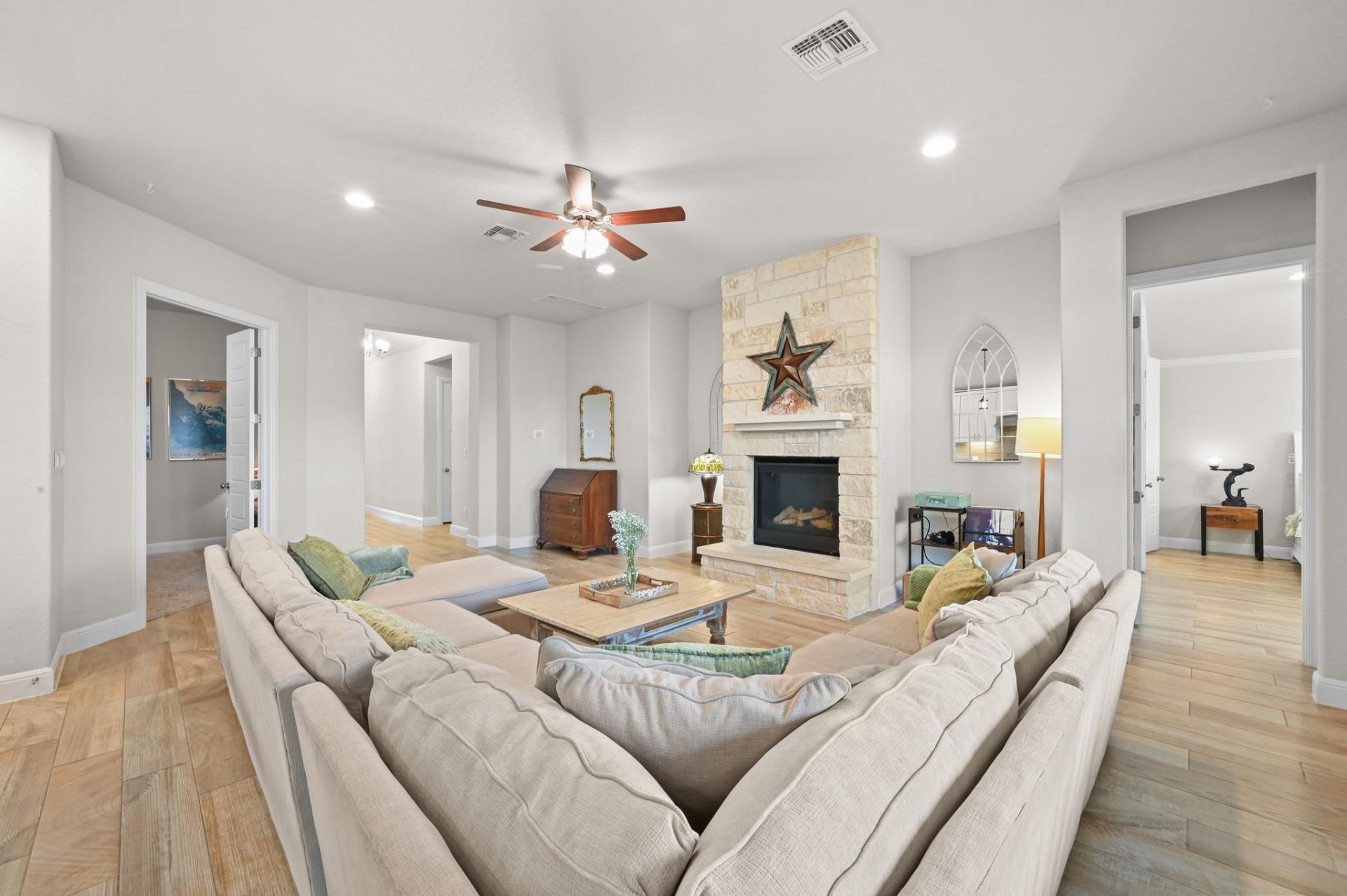 Why you want to see this stunning, meticulously cared for Scott Felder Home - One-story, 4 Bedrooms or 3 Bedrooms & Office, Theatre Room, almost 1/4 acre lot in the charming city of Kyle. It offers an exceptional blend of comfort and functionality, featuring four generously sized bedrooms, three full bathrooms, and an oversized two-car garage with a convenient 5-foot storage pop-out. Entertainment is taken to the next level with a dedicated Theatre Room, ideal for movie enthusiasts. The property boasts an open-concept layout that facilitates seamless living and entertaining. Notable interior enhancements include a striking floor-to-ceiling rock fireplace and wood-look tile flooring throughout much of the home. The gourmet kitchen is appointed with Silestone countertops, quiet-close drawers, under-cabinet lighting, and a built-in trash cabinet, providing both elegance and practicality. Ample natural light streams through numerous expansive windows, creating a bright and welcoming atmosphere. Situated on nearly a quarter-acre lot adorned with maturing trees, the outdoor space is complemented by a covered patio?perfect for enjoying the beauty of nature. Convenient access to I-35 ensures an effortless commute to Austin, San Marcos, and San Antonio. This residence is an invitation to experience refined living in a desirable location.