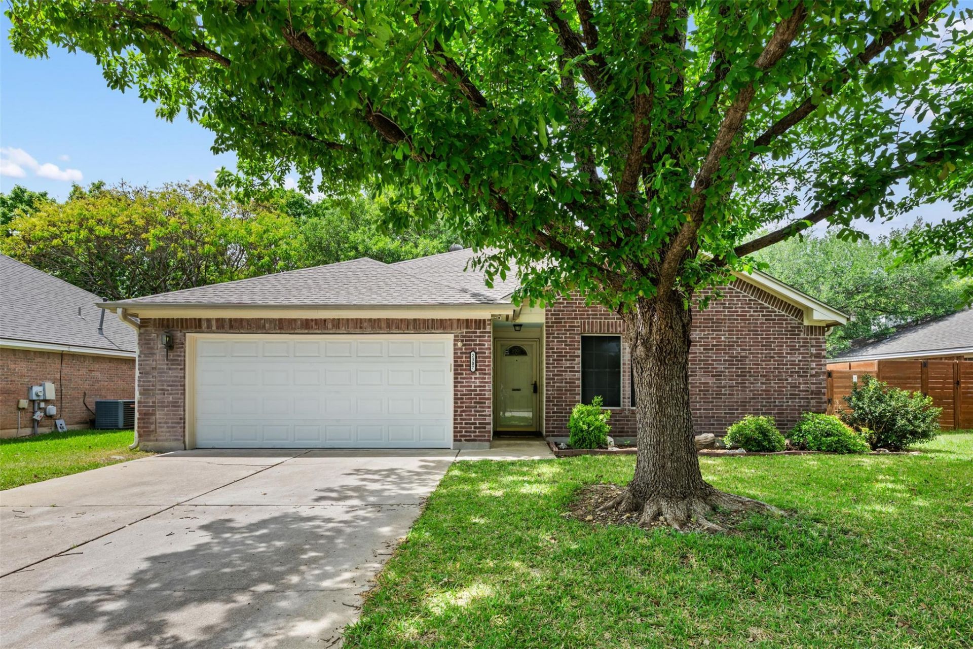 This well-kept 3-bedroom, 2-bath single-story home is located in the beautifully maintained South Creek neighborhood. Built with three-sided brick and durable steel supports instead of wood, it offers both quality and longevity. The home features a covered front entry, tile flooring throughout the main living areas, and a bright, inviting interior. The centrally located kitchen provides plenty of counter and cabinet space and flows effortlessly into the living room, highlighted by a tile-surround fireplace. The spacious primary suite includes dual vanities, a garden tub, a separate shower, and a walk-in closet. Outside, enjoy a fully fenced backyard with mature shade trees and a separate area ideal for a dog run or garden.