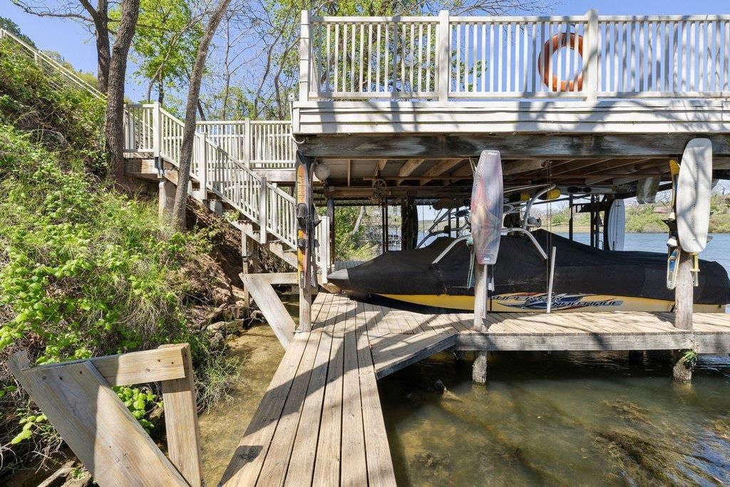 Rare opportunity on Lake Austin!Set on a prime stretch of Lake Austin, this refined waterfront retreat pairs effortless lake access with a low-maintenance, lock-and-leave lifestyle. Positioned on 1/3 acre, the property features a double boat dock with lift and multiple outdoor vantage points designed to capture the water from every angle. The main level hosts the primary suite with ensuite bathroom and adjacent laundry for seamless everyday living. Upstairs, vaulted ceilings enhance the open feel, complemented by new granite surfaces, custom hardwood cabinetry, and new appliances throughout. A Class 4 metal roof, new decking, and a two-car garage further elevate the homes ease and durability. The third bedroom bunk room comfortably accommodates four, offering flexibility for guests. Laundry room not included in square footage, getting updated square footage. Offered with furnishing options, this is a turnkey opportunity on Lake Austin.