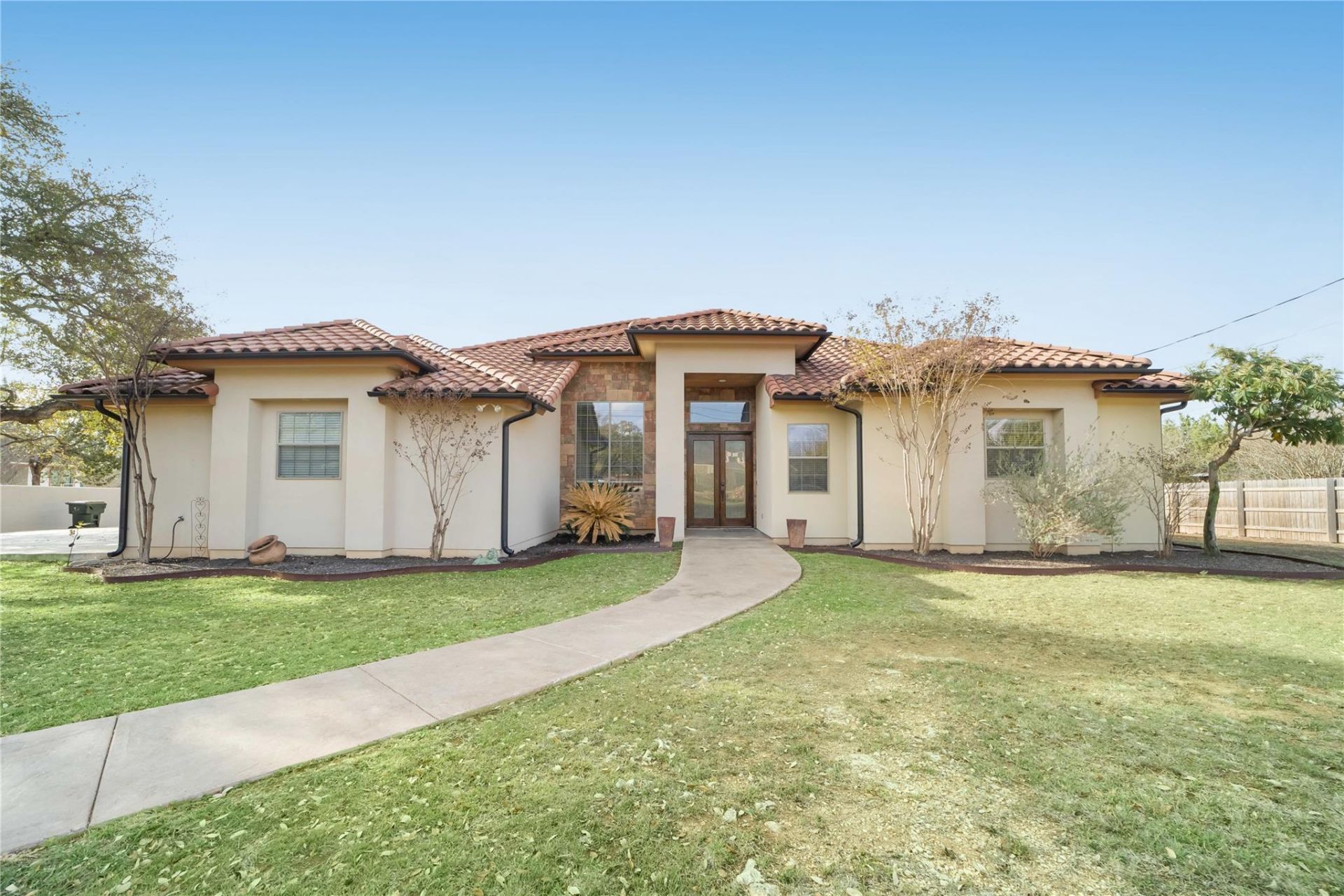 Set on a full acre with mature trees and plenty of breathing room, this 4-bedroom, 2.5-bath custom home offers well-laid-out living space with a clean, Hill Country-style exterior that feels welcoming from the start. The layout has an open floor plan and plenty of room to cook, gather, and entertain. There is a large covered patio with a built-in fireplace and a fully fenced yard that gives you privacy and space to make this your own backyard retreat. Add in energy-saving solar panels to keep utility bills low AND a location that keeps you within a reasonable drive to both Austin and San Antonio, and youve got a property that checks all the boxes!