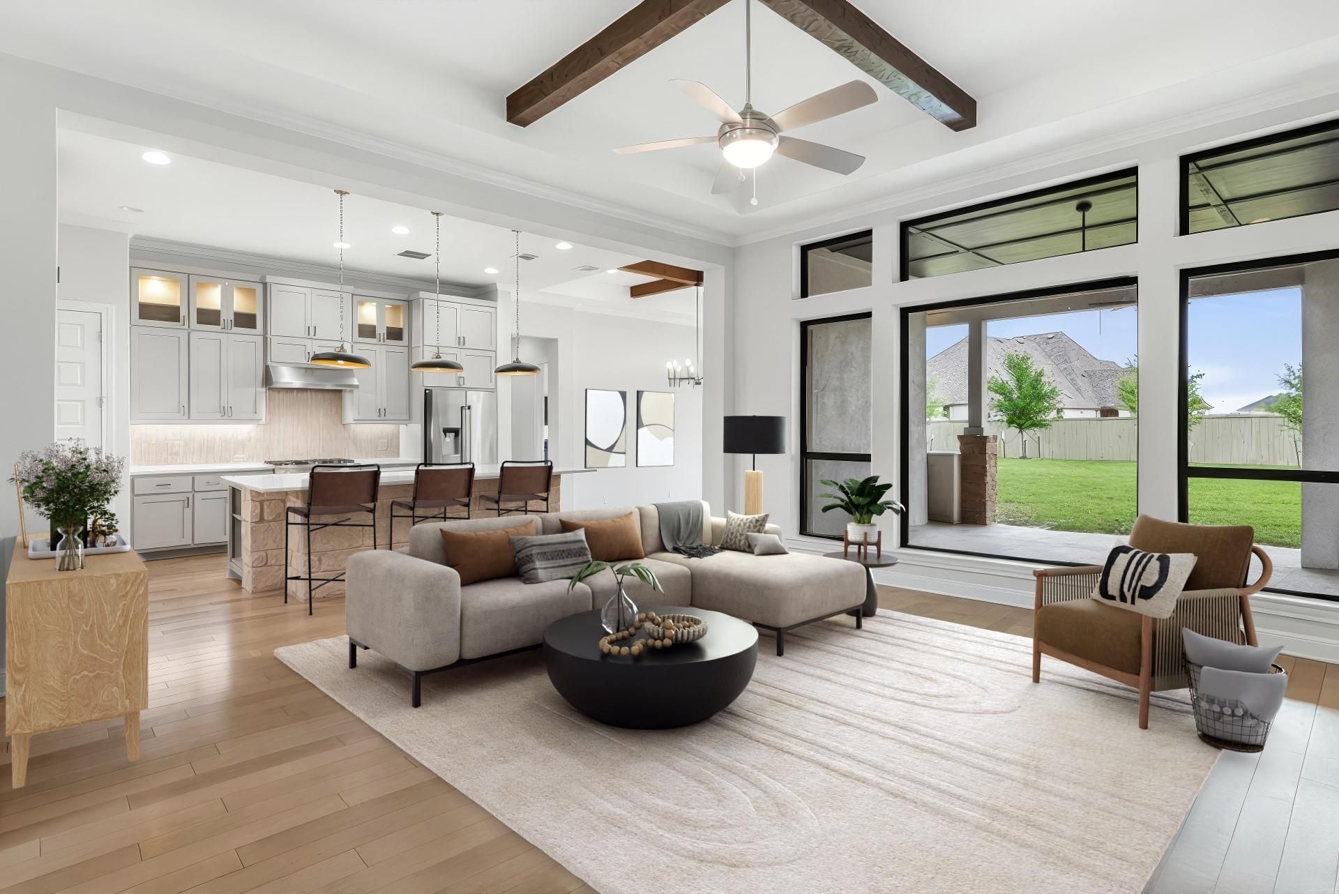 Located in the highly sought after community of Santa Rita Ranch, this former model home sits on an expansive 90 foot homesite spanning over one third of an acre with no direct back neighbors. This single story residence offers over 3,100 square feet with four bedrooms, five bathrooms, and a thoughtfully designed layout that blends luxury with functionality.From the moment you enter, the home showcases elevated design with tray ceilings, crown molding, and abundant natural light. The main living area is anchored by a floor to ceiling stone fireplace and flows seamlessly into the chefs kitchen, featuring a striking stone island with built in storage, a six burner industrial range, double ovens, two pantries, under cabinet lighting, and custom cabinetry extending to the ceiling with glass fronts and integrated lighting.The primary suite is a true retreat, offering a spa inspired bathroom with tile to the ceiling, a frameless super shower with two shower heads including a rain head, and dual benches for a luxurious experience. All secondary bedrooms are ensuite, providing privacy and comfort for family and guests alike. A dedicated office with French glass doors and a closet adds flexibility while creating clearly defined living spaces throughout the home.Step outside to an oversized covered patio designed for entertaining, complete with a full outdoor kitchen and fireplace, all overlooking the spacious backyard with no direct rear neighbors. The three car garage features epoxy flooring, adding both function and a clean finished look.Additional upgrades include premium hardware throughout, thoughtful designer touches, and the elevated finish out expected from a former model home. Located in Liberty Hill within Georgetown ISD, Santa Rita Ranch offers resort style amenities including pools, parks, trails, fitness center, and community events, making this home an exceptional opportunity in one of the areas most desirable neighborhoods.