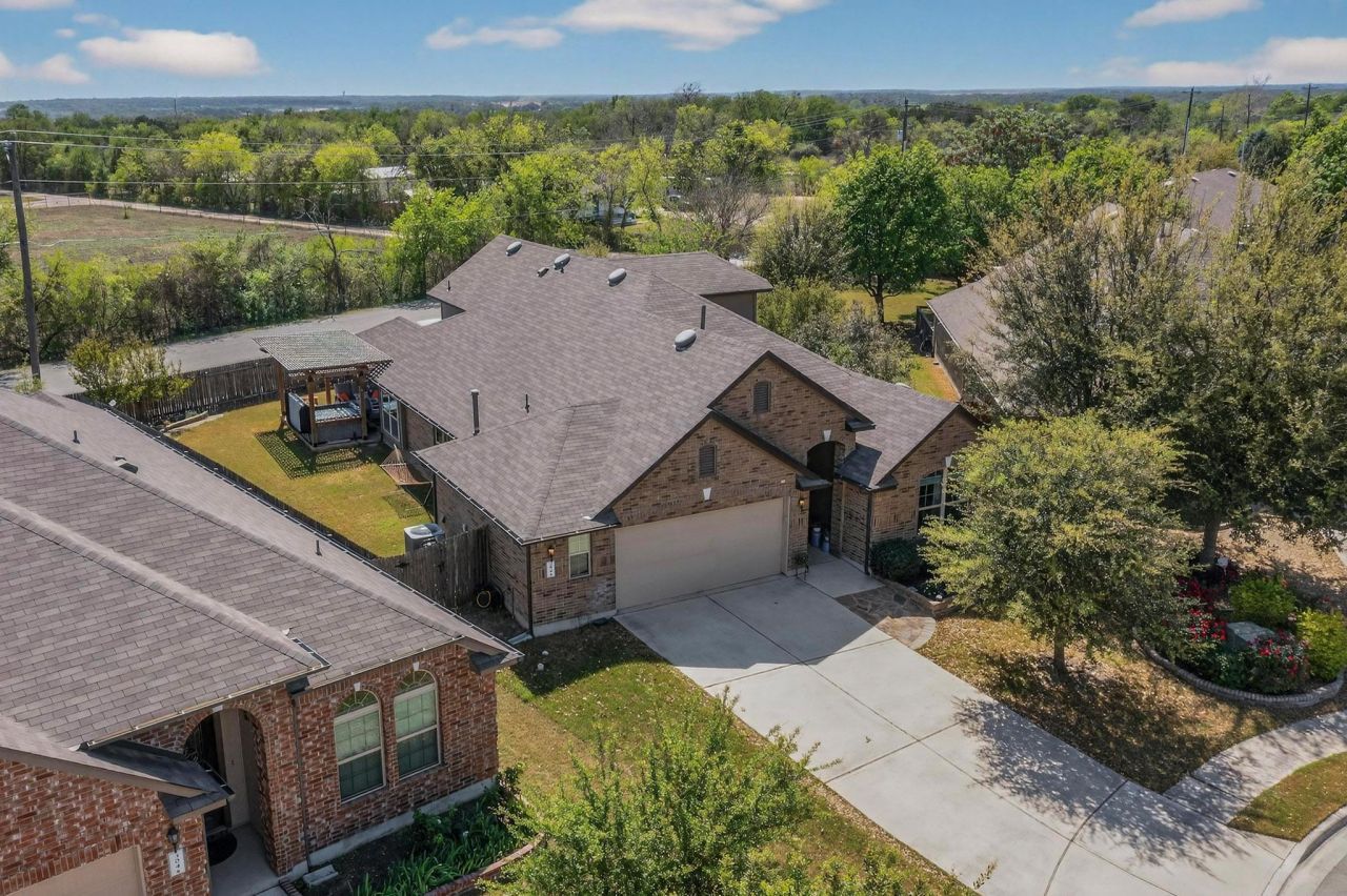 Nestled on a semi cul-de-sac in the desirable Whispering Hollow community, this spacious two-story home offers 2,617 square feet with 5 bedrooms, 3 full baths, and a flexible layout designed for comfortable everyday living. High ceilings and abundant natural light enhance the open floor plan, creating an inviting atmosphere throughout the main living spaces. The expansive living room provides plenty of room for entertaining and flows seamlessly into the eat-in kitchen. The kitchen is equipped with granite countertops, new stainless steel appliances, a breakfast bar, separate center island, and generous cabinetry for ample storage. The private primary suite features a vaulted ceiling, 2 separate His & Hers walk-in closets, and a spa-like bathroom with separate granite-topped vanities, a soaking tub, and walk-in shower. Three additional guest bedrooms are located on the main level, while upstairs offers a versatile game/media room, a full bath and a fifth bedroom ideal for guests or a home office. Step outside to enjoy the covered back patio with conveying hot tub under a pergola, a gas grill overlooking the huge fenced backyard with stone flower beds, offering plenty of space to add a pool or create your own dream outdoor retreat. Residents of Whispering Hollow enjoy access to community amenities including a park, 2 playgrounds, trails and a pool, all in a convenient Buda location. Schedule a showing today!