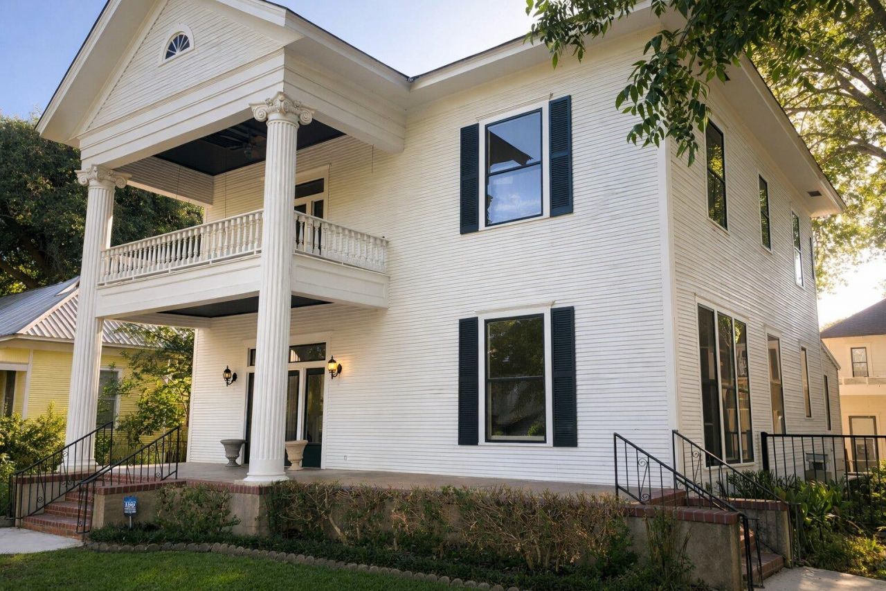 A true piece of Smithville history, this 1902 home blends historic character with modern living. Originally built for the daughter of the Buescher family, it stands out with its timeless two-story columns, covered front porch, and second-story balcony, rarely found today. Inside, original longleaf pine floors (restored in 2020), tall ceilings, and large windows preserve its charm while creating an open yet purposeful layout. Downstairs offers a main living area, dining space (now a secondary living room), kitchen, and updated laundry area. The kitchen combines refreshed cabinetry, fixtures, and appliances with period style, plus backyard access. Upstairs, four bedrooms and two bathrooms include a primary suite and another bedroom with working fireplace and balcony access, currently used as an office/TV room. The remaining bedrooms share a hallway bath with walk-in shower. Major updates include a 2020 roof and renovations to the laundry, kitchen, and upstairs baths. Out back, a detached garage apartment with full kitchen and bath is grandfathered under city code and ideal for guests, rental income, or family. The property also includes a large covered carport and a swim spa, enhancing outdoor living. This home offers history, flexibility, and long-term potential right in the heart of Smithville.