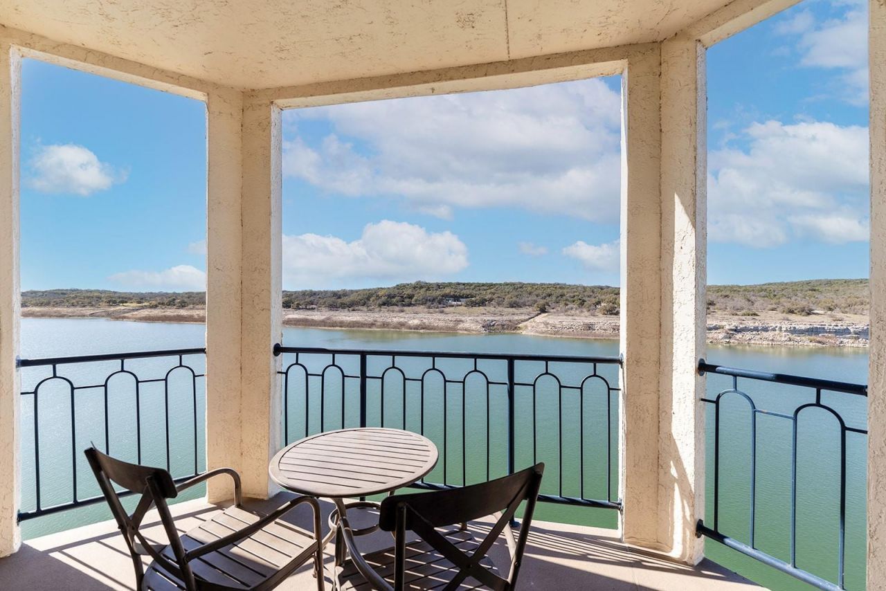 Fully Furnished beautiful waterfront unit at the Island with panoramic views of Lake Travis and the Texas Hill Country. This unit is on the corner providing some of the most favorable views of the entire community. At 1250 sq ft with 2 bedrooms, 2 full baths and access to all the Island amenities including indoor & outdoor pools, hot tubs, workout facility, restaurant, tennis courts, picnic areas, and Day Spa open on weekends by appointment. This villa has been fully updated, furnished and themed tastefully throughout. Can sleep up to 6 for rental. Additional amenities include a fully equipped kitchen, fireplaces, HDTVs, WiFi, washer/dryer, and a large wrap-around patio with separate seating areas and miles of scenic views and beautiful sunsets over Lake Travis. This is a truly unique waterfront villa with luxury, comfort, spacious living areas, incredible views, and access to all the amenities at the Island on Lake Travis. Book now and create lasting memories with family and friends!The Island on Lake Travis features a gated entry for security, reserved parking, beautiful Mediterranean architecture, and landscaped courtyards throughout the complex. The entry for this unit is the most private with its own short angle hall, providing unique coverage.