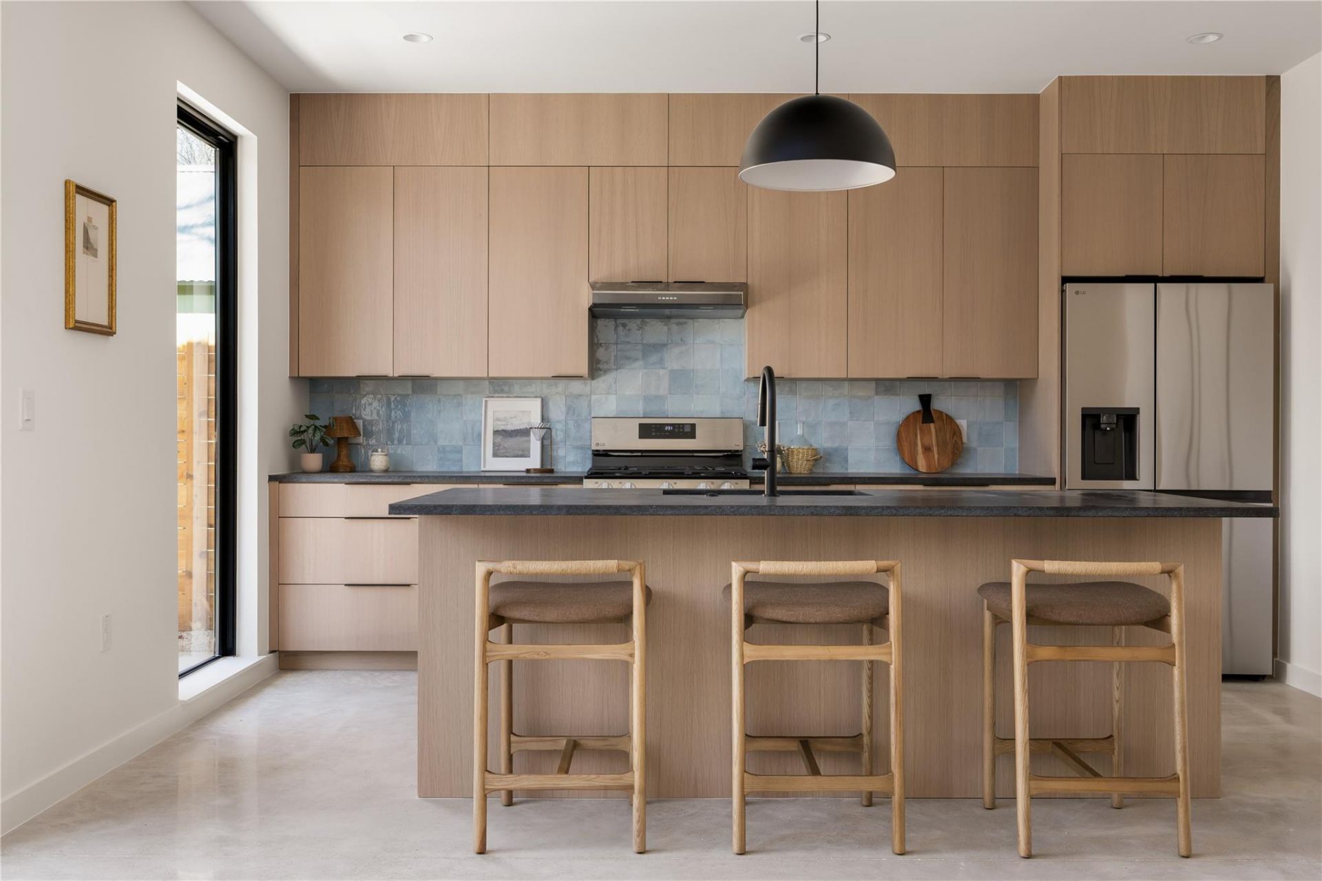 3 bed, 2.5 bath in Govalle, designed and built by Forsite Studio. 1,800 square feet of open-concept living with high ceilings, big windows, and natural light throughout. Flex room on the main level, upstairs laundry next to the bedrooms. Private pool, outdoor space set back from the street for real privacy in one of East Austin's most walkable neighborhoods. Attached carport.