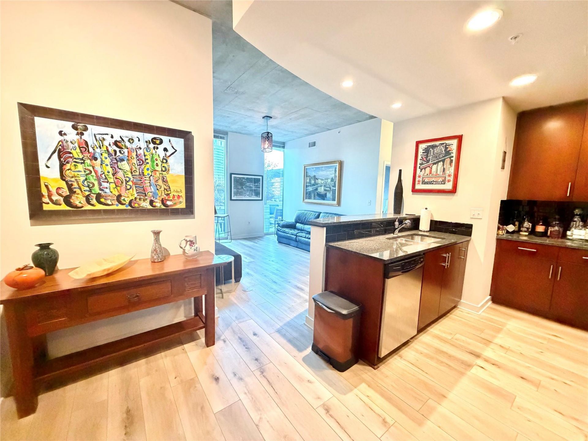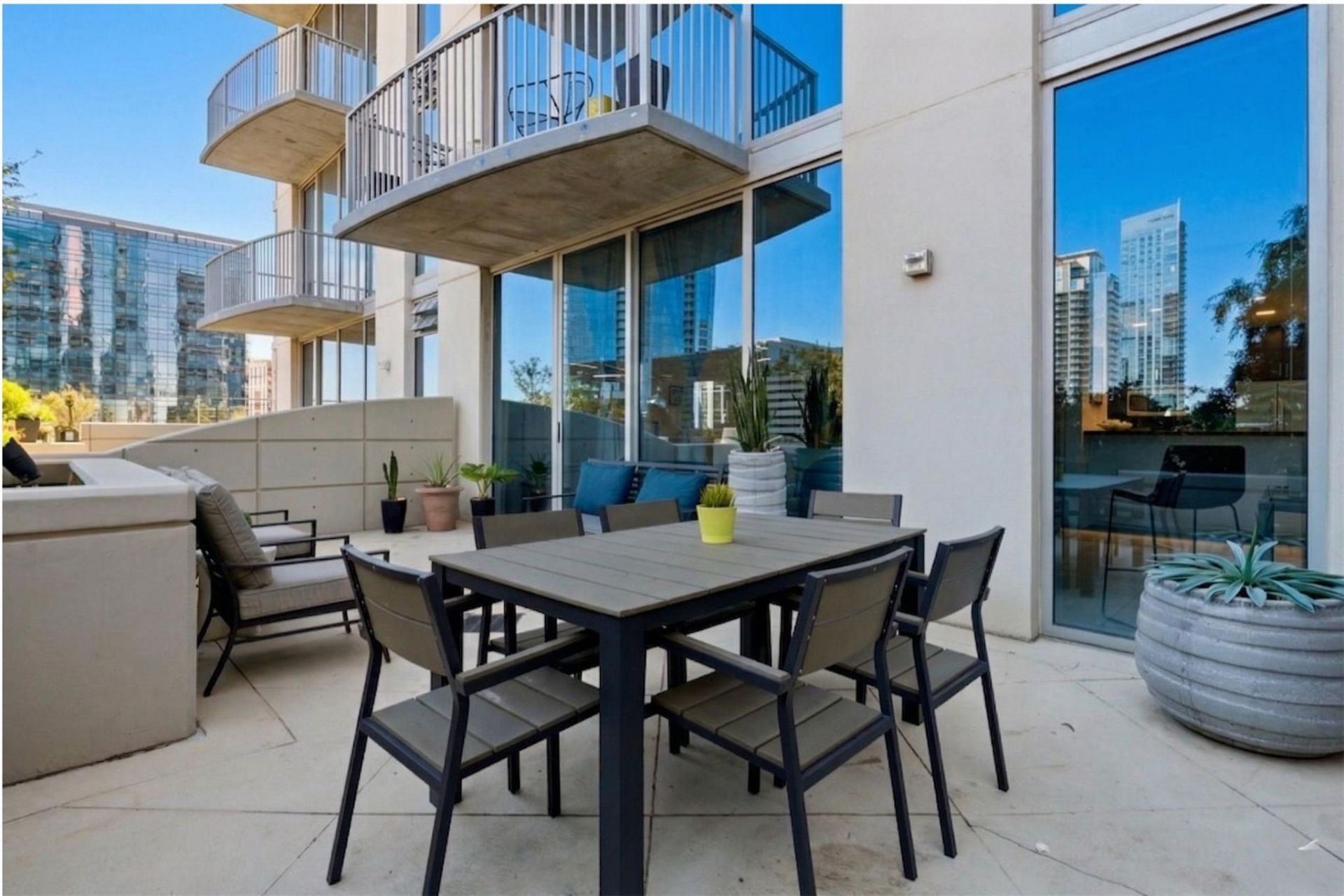 Rare opportunity to own a downtown condo that truly lives like a home, featuring an expansive ~348 sq ft private patio with direct access to the 9th floor amenity deck. This oversized one-bedroom offers 832 sq ft with a flexible layout, including space for a dining area or home office. The open kitchen flows into the living area with a breakfast bar, ideal for entertaining.The spacious bedroom offers added privacy with a true enclosed layout and features a large walk-in closet, along with a dual vanity bathroom for added functionality. Enjoy seamless indoor-outdoor living with your private patio just steps from the pool, grills, fitness center, and club room. Located in the heart of downtown, offering walkability with the added benefit of exceptional outdoor space?something rarely found in condo living.