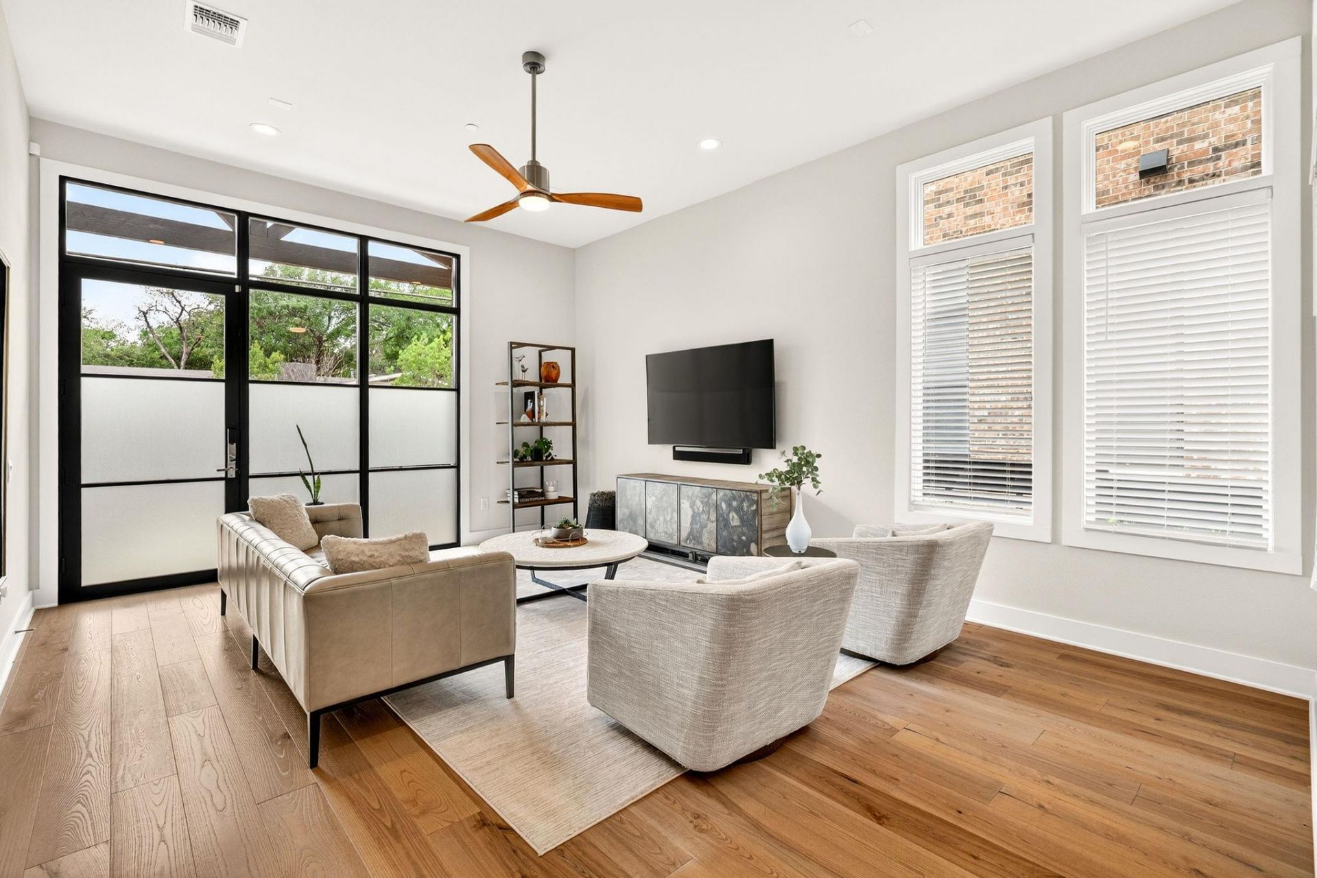 This exceptional residence in The Grove is set within one of Central Austins most sought-after, master-planned communities renowned for its thoughtful design, lush green spaces, and unparalleled walkability to restaurants, retail and Austin's renowned hike and bike trails. The highly desirable Palmetto floor plan showcases a light-filled, open-concept layout with 3 bedrooms, 2.5 bathrooms, an oversized gameroom plus an additional office/flex space. The vaulted ceilings, expansive windows and bright refined finishes create an airy elegance throughout and each living space/bedroom has been carefully designed to maximize both comfort and functionality. At the heart of the home, the chef-inspired kitchen makes a striking first impression. Designed with quartz countertops, stainless steel appliances, built-in refrigerator, abundant cabinetry, a walk-in pantry, a built-in dining banquette and a dedicated coffee bar, it seamlessly connects to the main living area and is perfectly suited for both everyday living and sophisticated entertaining. Just outside from the kitchen is 1 of 2 covered patios to enjoy morning coffee or al fresco dining. The primary suite, conveniently located on the main level, offers a private retreat with generous proportions, a spa-like ensuite bath and a spacious closet designed for effortless organization. The beautiful primary bathroom includes a dual vanity, soaking tub and glass enclosed shower with floor to ceiling tile. Upstairs, two well-appointed secondary bedrooms are complemented by two versatile bonus spaces which are ideal as a game room, office or additional living/entertaining areas. Also upstairs is an oversized laundry room featuring extensive counter and cabinet space along with a utility sink. The additional outdoor covered patio is located upstairs just off of the living spaces. This home is ideally positioned in the heart of the city and offers a sophisticated blend of modern luxury and elevated urban living.