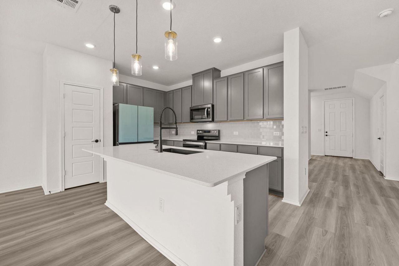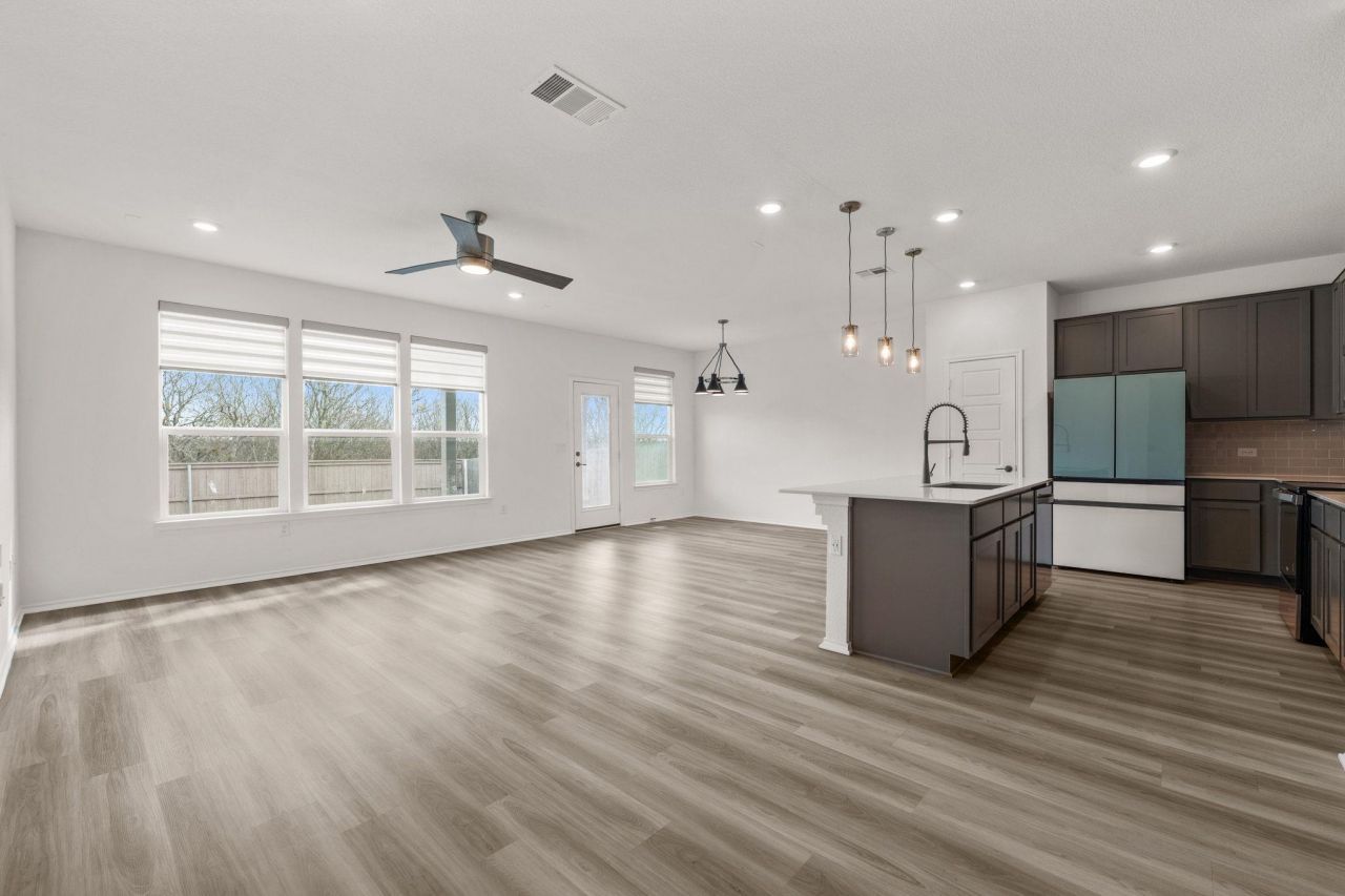 Contemporary greenbelt living in McKinney Crossing, a newer SE Austin community with easy access for commuting, this two-story home offers over 2,500 sq ft with 4 bedrooms, 2.5 baths, multiple living and dining areas, a covered porch, and a fenced backyard. Neighborhood amenities include a park, playground, and sports court, with Skyline Park and McKinney Falls State Park just around the corner. The main level features an open layout with tall ceilings, abundant windows, and greenbelt views. Wood-look luxury vinyl plank flooring, neutral finishes, recessed lighting, and modern fixtures create a cohesive feel. The kitchen centers around a large island with breakfast bar seating and includes quartz countertops, tall cabinetry, subway tile backsplash, and modern appliances. A flexible front room works well as a second living area, formal dining, office space, or even a playroom.The main-floor primary suite overlooks the backyard and wooded greenbelt, offering privacy along with an ensuite bath featuring a walk-in shower, dual vanity, and walk-in closet. Upstairs youll find a large bonus living area wrapped in windows, along with three secondary bedrooms and a full bath with dual vanity. A guest powder room and dedicated laundry room are also located on the main floor.Out back, there is no rear neighbor. The covered patio provides space to relax or expand, and the yard is ready for your personal touch.Convenient to McKinney Falls State Park, Southpark Meadows, Downtown Austin (about 11 miles), and Austin-Bergstrom International Airport (about 8 miles), with easy access to I-35 and 183. A solid opportunity for a newer home with space, flexibility, and privacy in a rapidly growing area. All appliances convey with sale. Great low tax rate. Come take a tour today!