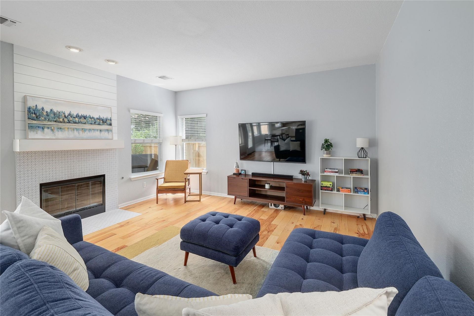 Charming two-story home in the highly sought-after Stone Canyon subdivision in Brushy Creek. Beautiful light-toned engineered hardwood floors welcome you into a spacious formal living and dining area. The well-appointed kitchen features Corian countertops, a tumbled tile backsplash, and freshly painted cabinetry. An open-concept layout seamlessly connects the kitchen, breakfast area, and family room, highlighted by a custom tile fireplace and an abundance of natural light from numerous windows. A convenient double staircase leads upstairs to a generously sized primary suite. The updated primary bath includes a dual vanity, upgraded tile finishes, a separate shower and soaking tub, and a spacious walk-in closet. Three oversized secondary bedrooms offer large closets, complemented by an updated secondary bathroom with a custom vanity and tiled shower. Step outside to a large covered patio that connects to a Tec-Dec deck, and overlooks an expansive and beautiful backyard. Zoned to award-winning schools?Fern Bluff Elementary, Chisholm Trail Middle School, and Round Rock High School. Enjoy exceptional nearby amenities within walking distance, including Brushy Creek Regional Trail, Stone Canyon Pool Center, and Fern Bluff Park, offering tennis and basketball courts, a pavilion, soccer and baseball fields, sand volleyball, and a playscape.