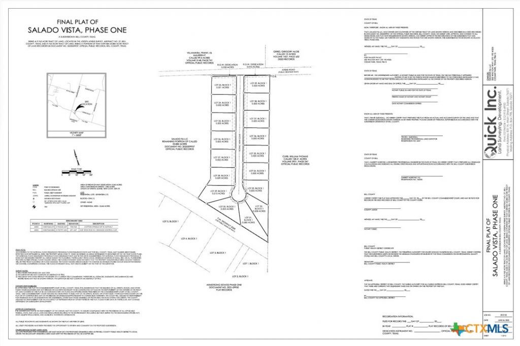 Platted 39 lot neighborhood for sale. Phase 1 and Phase 2 preliminary plats and construction drawings approved by Bell County in Q4 of 2025. Two phases, so construction on all 39 lots does not need to take place at the same time. 17 lots in Phase 1, 22 lots in phase 2. Construction ready, inquire for details and plans. Located just 5 minutes from I35, Salado ISD and directly across the street and in close proximity to multiple other large developed/new neighborhoods in Sterling Meadows and Flint Ridge. Ag/Wildlife exemption currently in place. No FEMA floodplain.